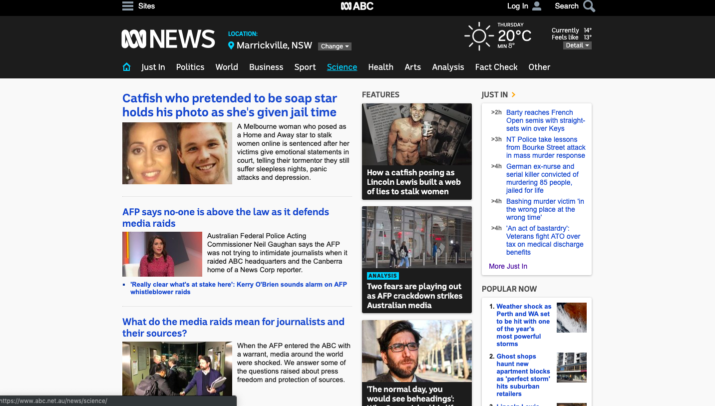 ABC News Online is a well designed online news site. The general outlay of the site sees news divided into clear tabs related to their category e.g. ‘politics’, ‘world’, ‘sport’ and analysis to name a few. This enables a user to navigate to specific areas of news that interest them the most, or looks for a specific story they saw a glimpse of earlier and want to read in full. There is also the option to select your location, which sees news stories altered dependent on their proximity and priority to your specified location. This is a good way for users to consume news that is most relevant to where they’re living. However, it’s possible that some users may find this feature slightly frustrating, as they may be interested in an overall national focus, or want to hear about things happening interstate, rather than seeing their feed heavily focused on their own state. There is also a features tab which offers more in-depth, longer reads in to issues ranging from serious political analysis to lifestyle and pop-culture pieces. This offers a break from hard news stories and offers content with more insight, allowing users to delve into stories they are really invested in. Some people could potentially argue that the purpose of a news site is solely news, and that this tab distracts from the matters at hand. On the right-hand side there are tabs for news ‘just in’, as well as some for ‘Did you miss?’ and ‘popular now’. These tabs all offer different stories that have made headlines in recent days, but I feel as if there are a few too many and it can be a bit overwhelming navigating the page as a whole. As you scroll down the page there are more and more tabs for different topics, some being ‘My Topics’, ‘Best of ABC.NET.AU” and “Photo Galleries”. I find that these tabs are too far down the page for them to be seen, and there are too many stories on display, which makes the lower half of the page quite convoluted. At the very bottom of the page is a site map. I feel it is rather counterintuitive to have a navigation tool at the very bottom of the page. Overall, I think that it encapsulates the biggest issue with the ABC News site. There are too many tabs and topics all over the place that if you scroll past the original news feed, it is very difficult to navigate. Despite this, the ABC news site remains a good site to find the leading news stories, and its initial news feed and tabs make it a navigable site.